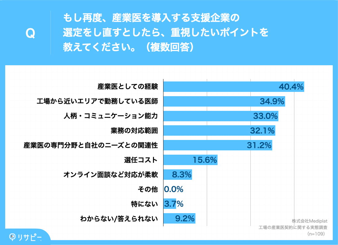 「再度、産業医を導入する支援企業の選定をし直す際に重視したいポイント」を質問したところ、「産業医としての経験」が40.4%、「工場から近いエリアで勤務している医師」が34.9%、「人柄・コミュニケーション能力」が33.0%という回答となりました。