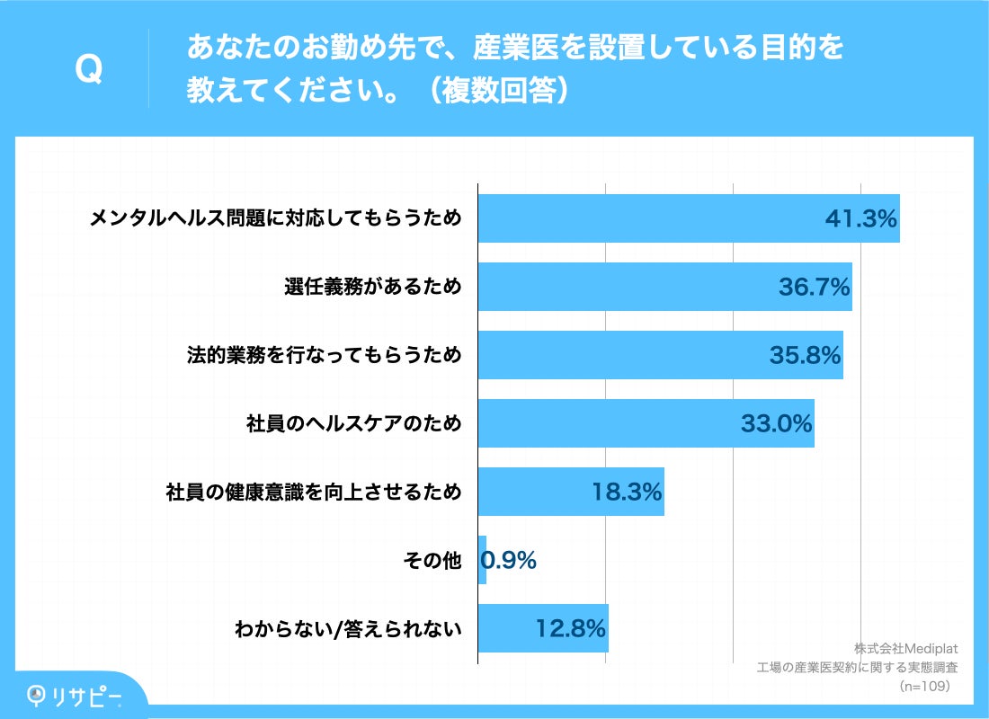 「産業医を設置している目的」を質問したところ、「メンタルヘルス問題に対応してもらうため」が41.3%、「選任義務があるため」が36.7%、「法的業務を行なってもらうため」が35.8%という回答となりました。
