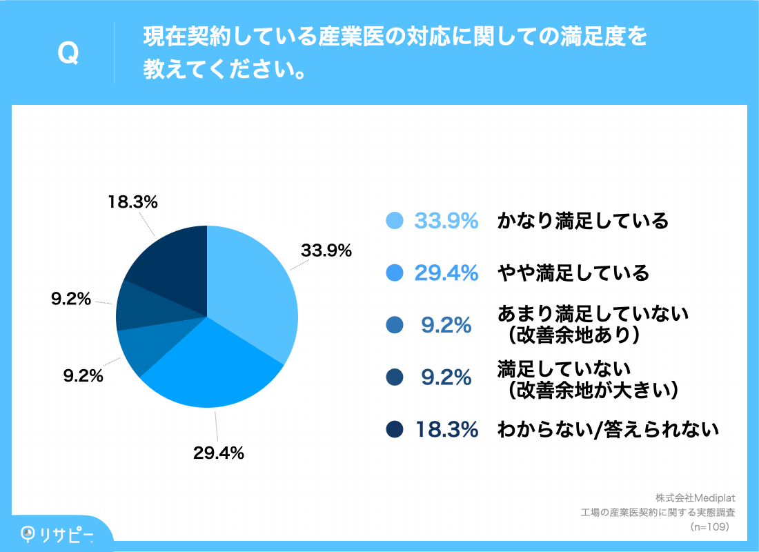 次に「現在契約している産業医の対応に関しての満足度」を調査したところ、「かなり満足している」が33.9%、「やや満足している」が29.4%と合計で63.3%が「満足している」という結果となりました。