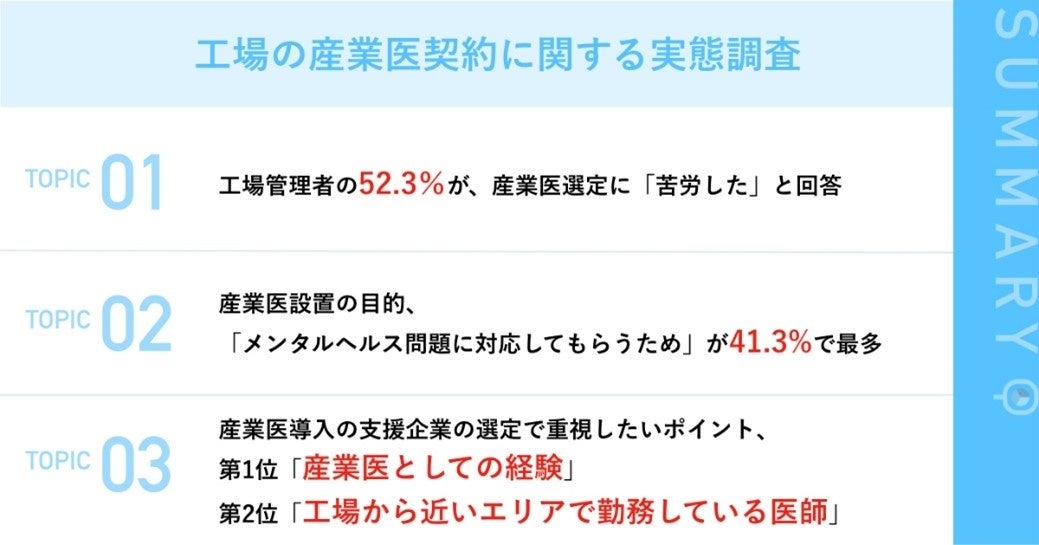 工場における産業医選定は、ニーズへの対応が重要であることがわかりました。