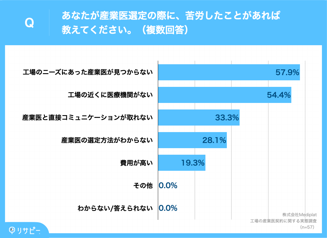 さらに、「かなり苦労した」「やや苦労した」と回答した方に、「産業医選定の際に、苦労したこと」を調査した結果、「工場のニーズにあった産業医が見つからない」が57.9%、「工場の近くに医療機関がない」が54.4%、「産業医と直接コミュニケーションが取れない」が33.3%となりました。