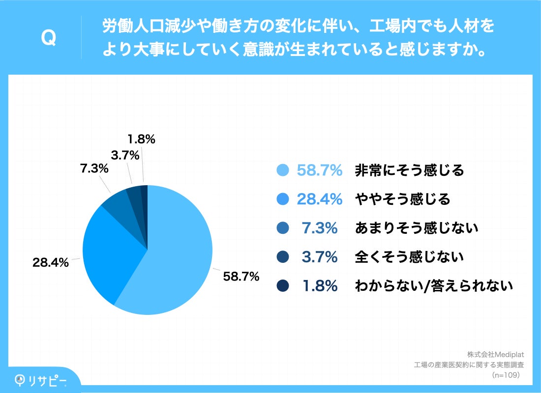 初めに、「労働人口減少や働き方の変化に伴い、工場内でも人材をより大事にしていく意識が生まれているか」を調査したところ、「非常にそう感じる」が58.7%、「ややそう感じる」が28.4%と約9割(87.1%)が「そう感じる」という回答となりました。