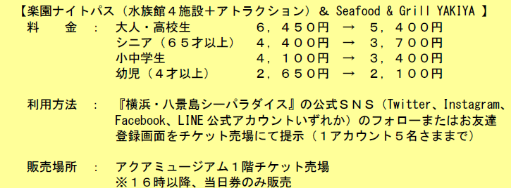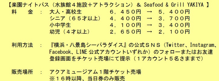 『横浜・八景島シーパラダイス』では、2022年8月20日(土)~10月10日(月・祝)の対象期間限定※で、当施設の公式SNSをフォローすると16時から使用できる「楽園ナイトパス」とBBQ食べ放題「Seafood & Grill YAKIYA」(90分間)を割引で楽しめる「夕涼みプラン」を販売いたします。
