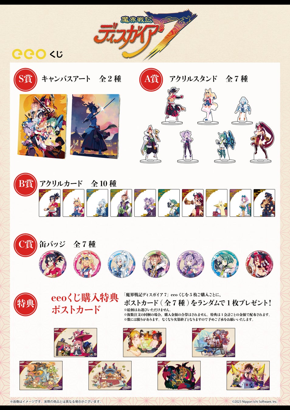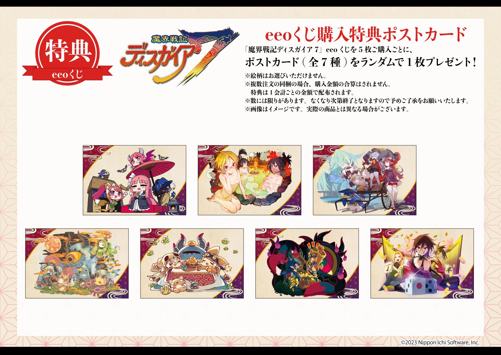 『魔界戦記ディスガイア7』の「eeoくじ」を1会計5枚お買い上げごとに、リザルトイラストを使用した購入特典ポストカード(全7種)をランダムで1枚プレゼント。