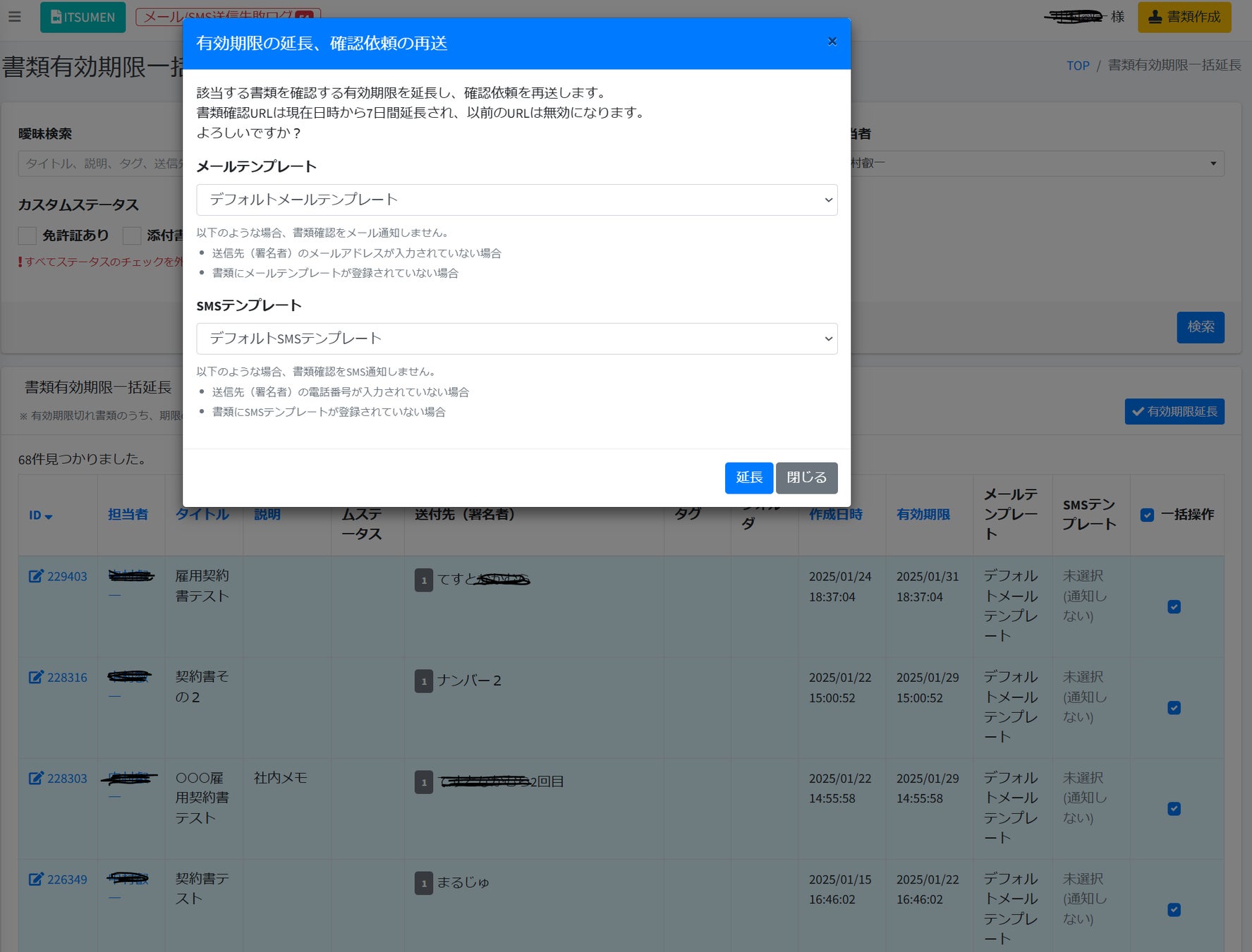 有効期限切れステータスになった書類を一括で延長することができる機能です。有効期限切れの書類が多数ある場合に役立ちます。特に多数の更新書類を一括送信機能で送信した際に発生しがちな有効期限切れ書類の再送信の手間を大幅に軽減いたします。