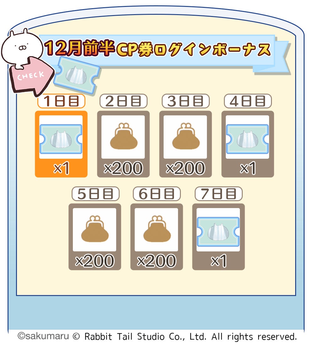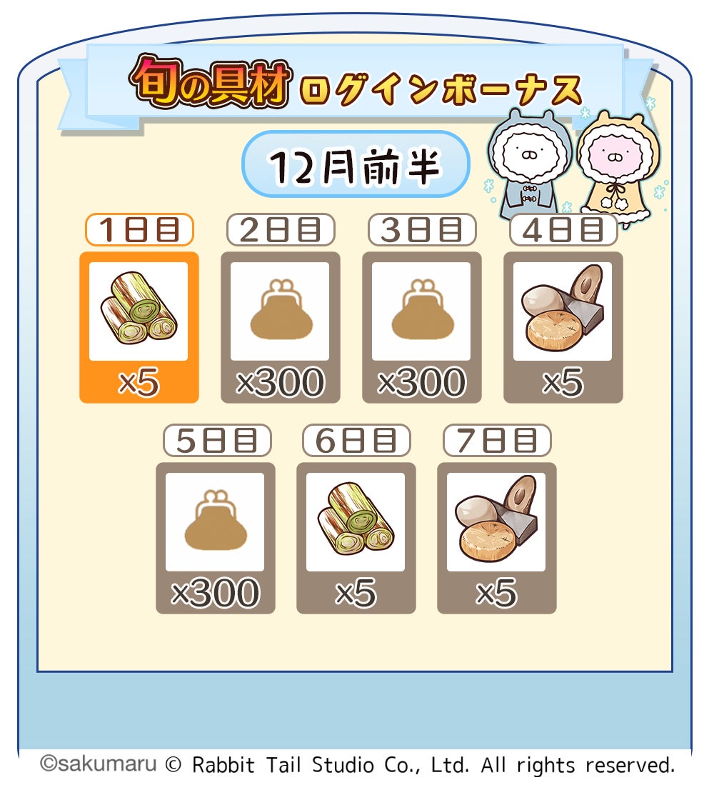 旬の具材が獲得できる12月前半CPセットで使えるキャンペーン券が獲得できるログインボーナスです。