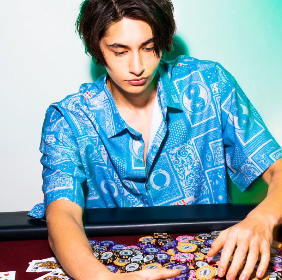 爽やかな水色トランプ柄が目を引くシャツ。 アクセントとして赤色を配置し爽やかながらもデザイン性の高い仕上がりに。 さらさらとした肌触りのオリジナル素材を使用し、高級感のある質感になっています。