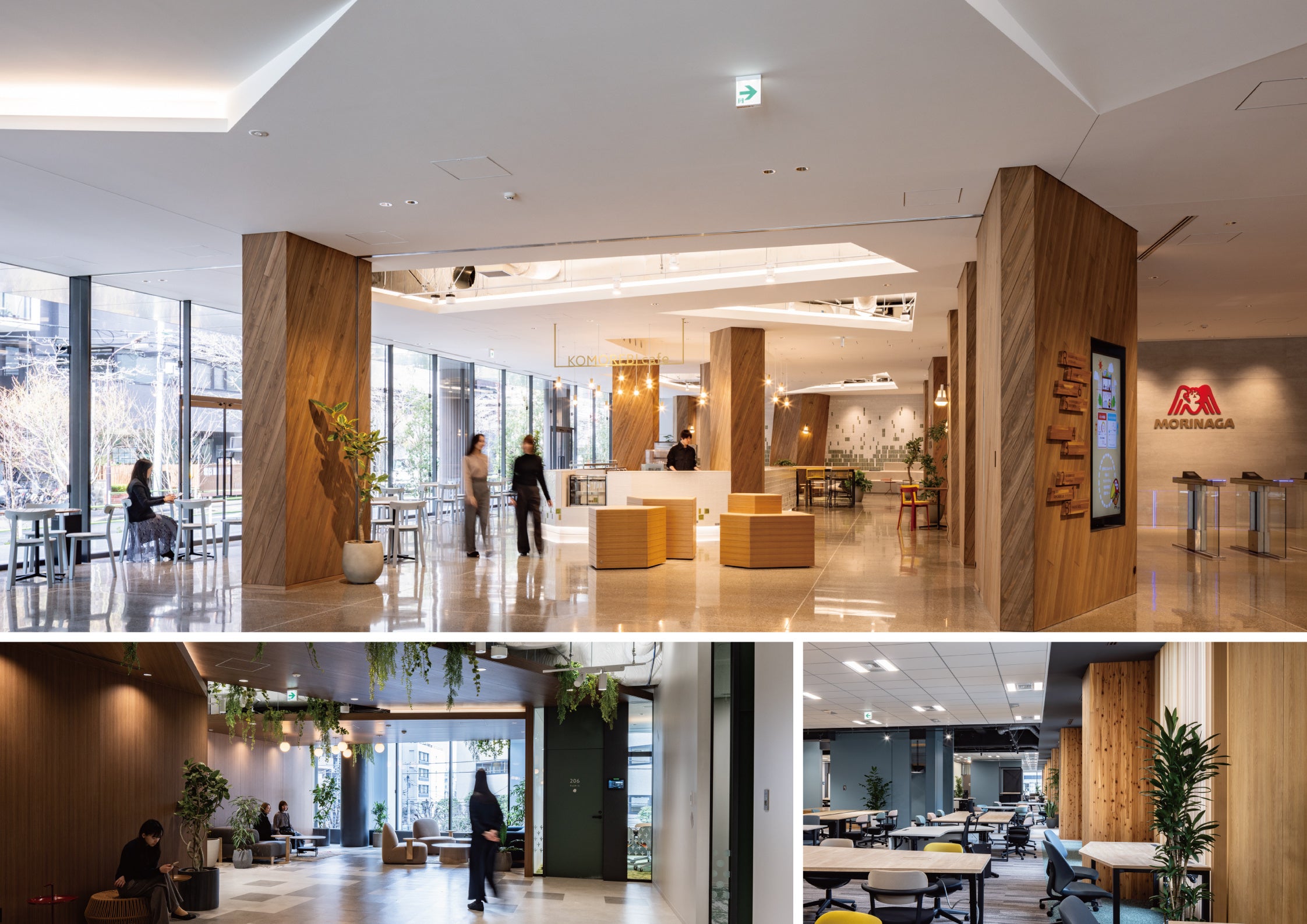 2024年3月に新設した「森永芝浦ビル」では、心と体そして環境の健康の実現拠点として、「カクハンノモリ」を建築コンセプトに、多様な生態系が共生する「森」のように、自然のゆらぎを享受しながら、様々な活動が混ざり合う環境共創型オフィスを目指しました。コロナ禍を経て、リアルオフィスの価値が問われる中で、社内外、そして地域のあらゆるステークホルダーが好きな場所を見つけて過ごしながら、関わり混ざり合うことで、知見を攪拌し、創造した実りを拡販しながら、様々な体験を生む、オフィスを目指しています。また、「森永芝浦ビル」は、実質的なCO2排出量をゼロに抑え、環境に配慮したオフィスであることも特長です。