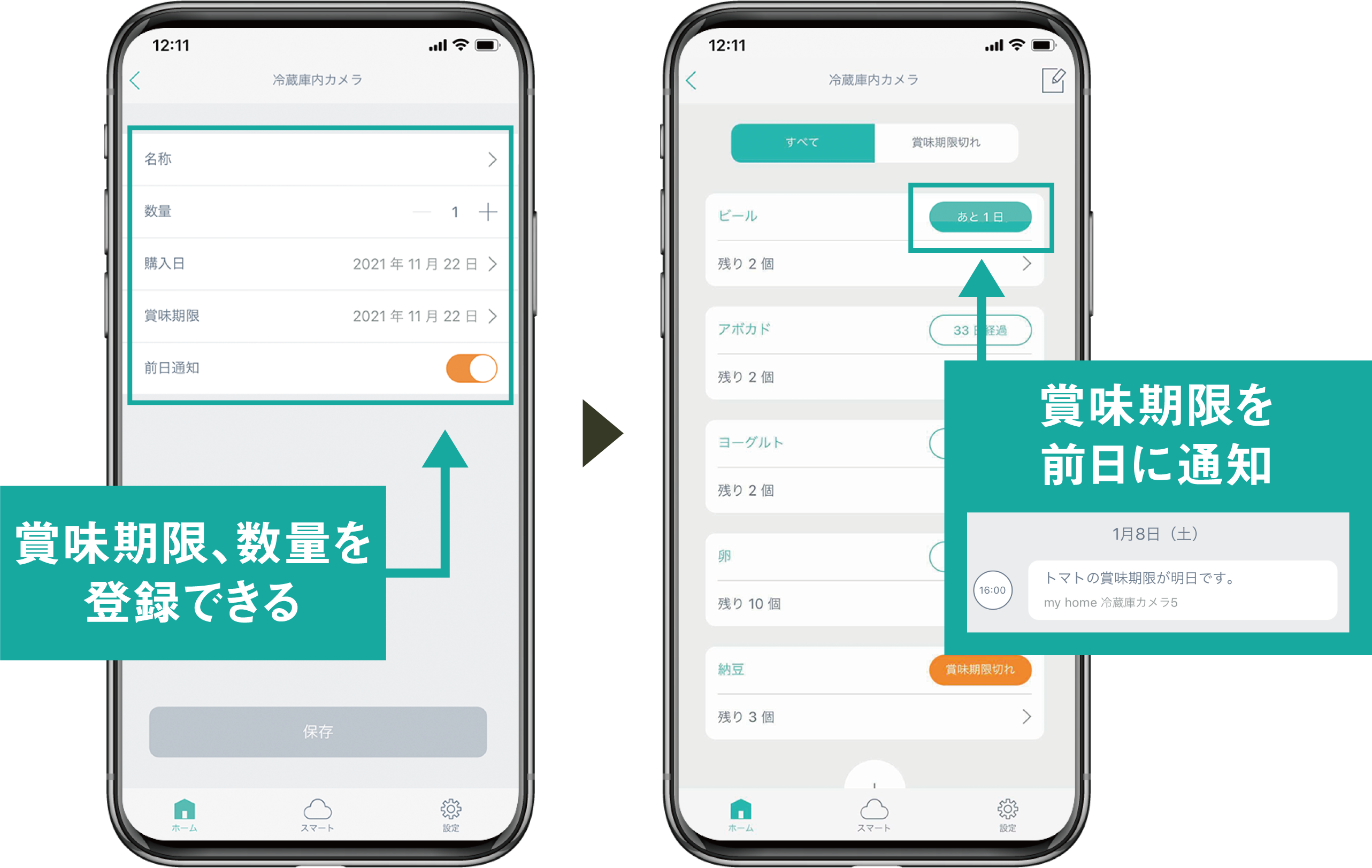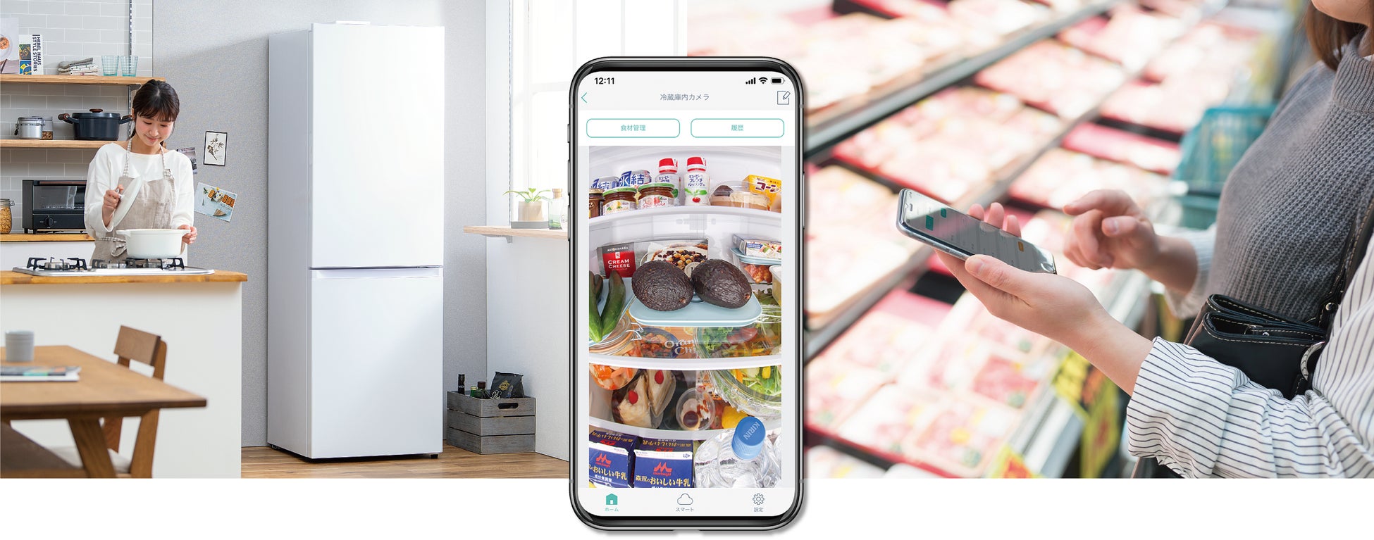 こうしたニーズや課題に対応するため、今回の新商品は冷蔵室内に搭載したネットワークカメラで、冷蔵室の扉を開閉後、約8分後から庫内を撮影し(※1)、その静止画像をクラウドに保存します(※2)。この画像は対応するアプリを通じて、外出先からスマートフォンで確認できるため(※3)、買い物の際に必要な食材の買い忘れや二重買いの防止に加え、買い物中に庫内を確認しながら献立を検討できます。アプリを通じて、庫内の食材の名称・個数・賞味期限を手動登録することにより食材管理でき、賞味期限前日の食材を事前に通知する機能により、賞味期限切れが原因の「食品ロス」を削減できます。