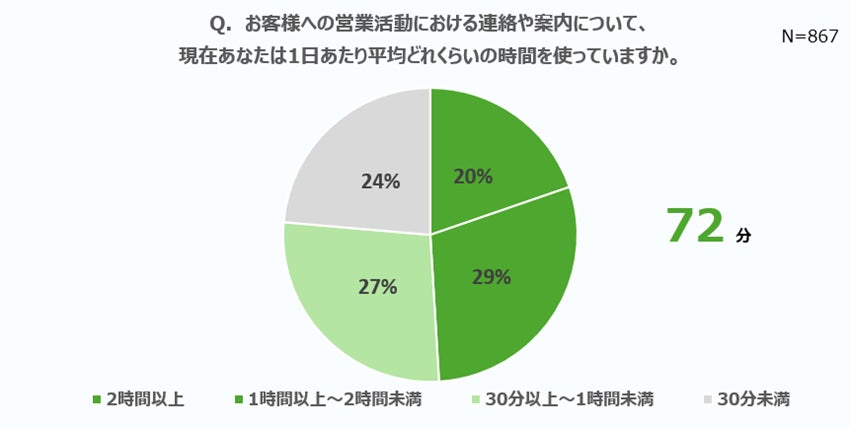 営業活動における連絡や案内にかけている時間については、1日あたりの平均時間は「2時間以上」20%、「1時間以上〜2時間未満」29%で、全体の約半数が「1時間以上」時間をかけていた。また、平均時間は 72分であった。