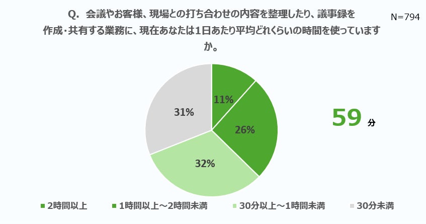 打ち合せ内容の整理や議事録作成にかけている時間については、1日あたりの平均時間は「2時間以上」11%、「1時間以上〜2時間未満」26%で、平均時間は 59分であった。