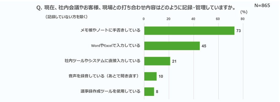 会議やお客様との打ち合わせ内容の記録方法については、「メモ帳やノートに手書きしている」が73%で最も多く、「WordやExcelで入力している」が45%と続いた。
