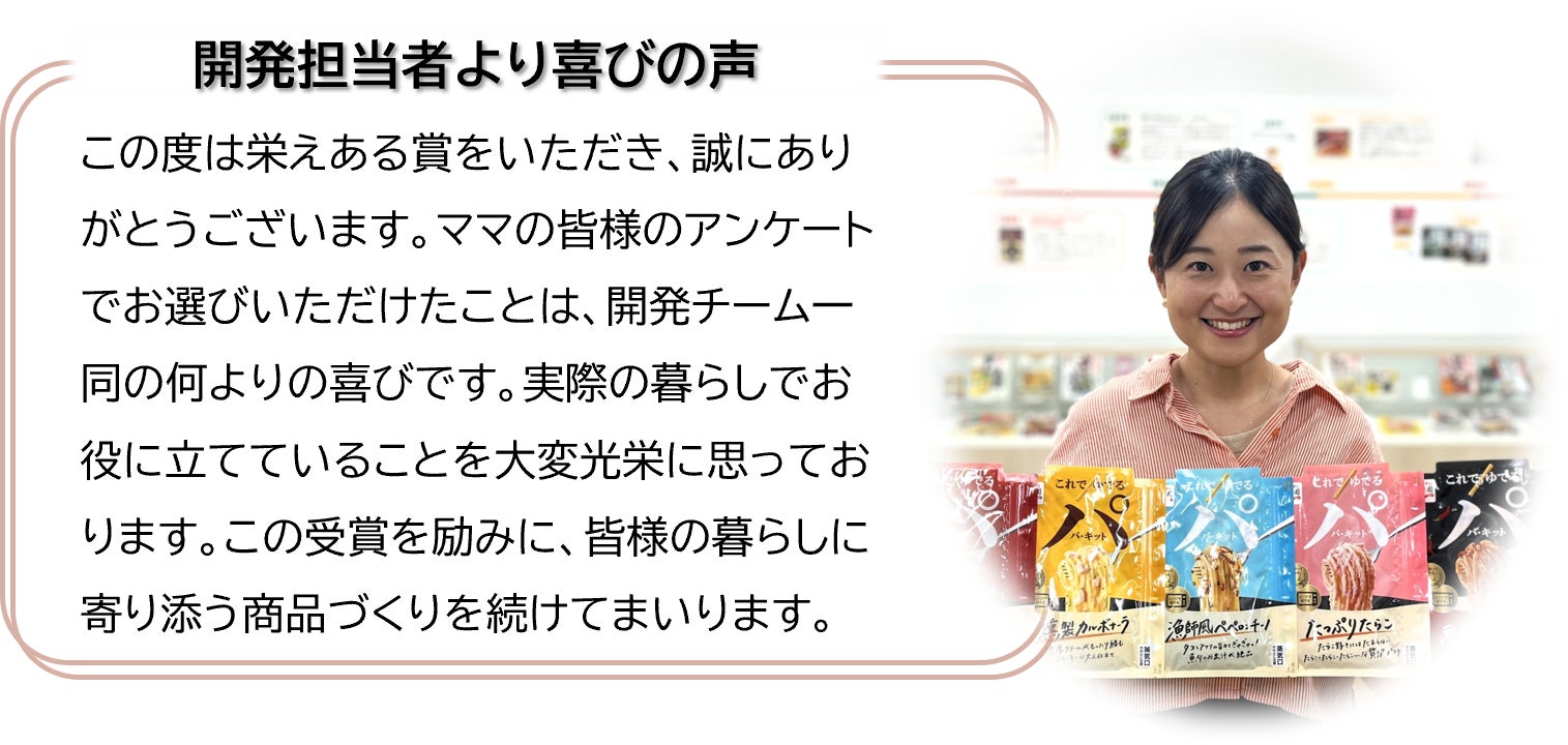 株式会社 永谷園(社長:掛谷 浩志、東京都港区)が発売する「パ・キット」シリーズが、リアルなママ・パパの声から選出される「マザーズセレクション大賞2025」(一般社団法人日本マザーズ協会主催)を受賞いたしました。 「パ・キット」シリーズは、パスタの茹でとソースの温めが電子レンジで一度にできるパスタソースで、「正直、パスタを茹でるのが面倒だった…」という声から誕生し、「パスタをパッと作りたい!」というお客様に2023年の発売以来ご愛顧いただいております。今回の受賞を励みに、弊社では、お客様に喜んでいただける商品開発を今後も進めてまいります。