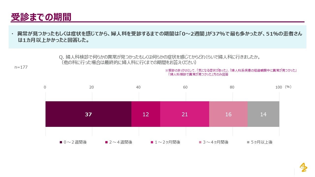 異常が見つかったもしくは症状を感じて婦人科を受診した患者さんにおいて、受診までにかかった期間は、「0~2週間後」(37%)が最も多い結果となりました。その一方で、51%が受診するまでに1カ月以上経過したと回答しており、初期から不正出血などの自覚症状が現れることが多い子宮体がんにおいても、診断が先延ばしにされている可能性が示されました。