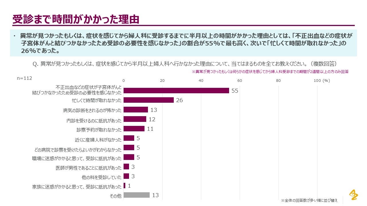 4. 異常が見つかったもしくは症状を感じてから婦人科を受診するまでに半月以上時間がかかった理由としては、「不正出血などの症状が子宮体がんと結びつかなかったため受診の必要性を感じなかった」の割合が55%で最も高かった。