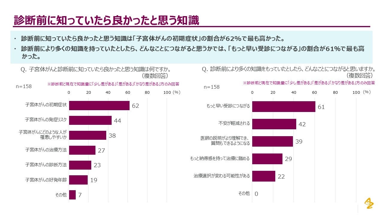 ⑤ 診断前に知っていたら良かったと思う知識は「子宮体がんの初期症状」が62%と最も多く、61%の患者さんが診断前により多くの知識を持っていたとしたら、「もっと早い受診につながる」と回答した。