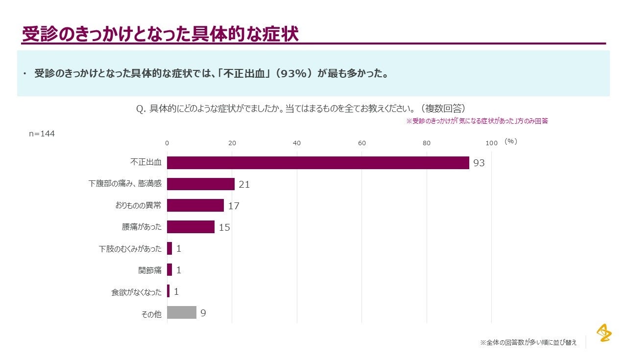 2. 気になる症状があったと回答した患者さんにおいて、受診のきっかけとなった具体的な症状として、93%が「不正出血」と回答した。