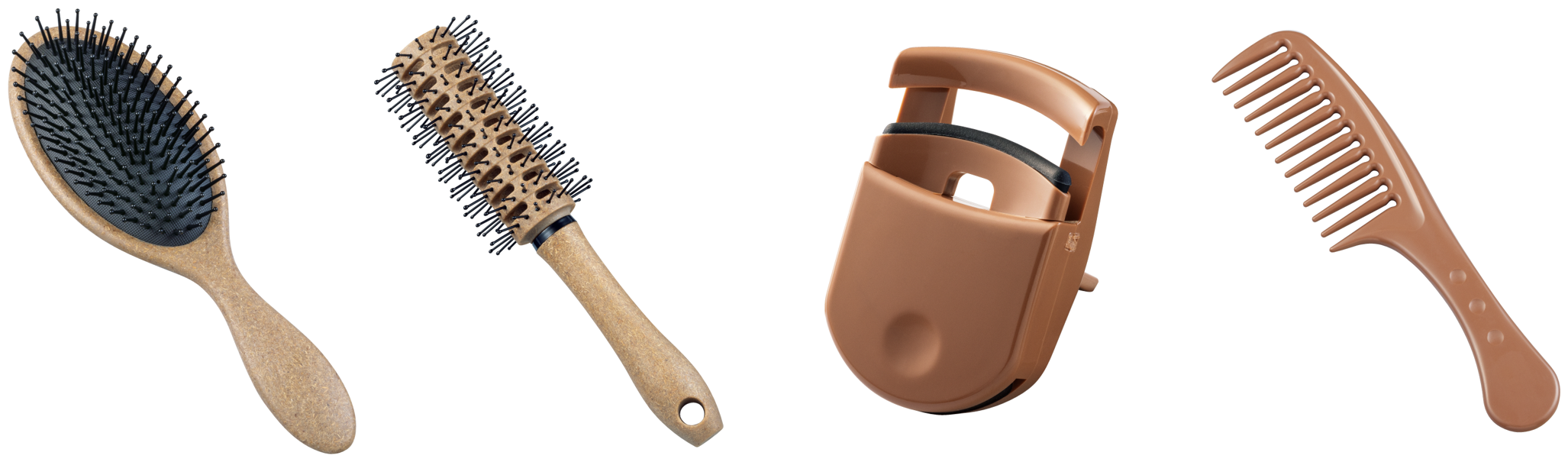 今回発売するのは「クッションブラシ」、「ロールブラシ」、「粗目コーム」、「アイラッシュカーラー」の4種類です。ブラシのハンドルの一部にはヤシの木の繊維を使用しており、ヤシの木を使用することで再生樹脂の使用を抑えるとともに樹脂の原料である石油の使用を減らすことができます。インテリアにも馴染みやすいアースカラーを採用しています。
