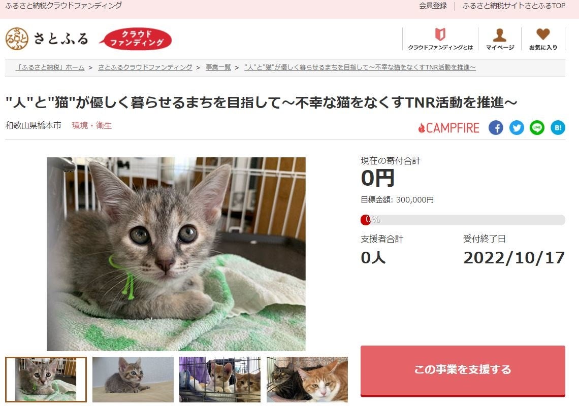 和歌山県橋本市とさとふる、飼い主のいない猫の捕獲・不妊去勢手術などを行うTNR活動を推進するため、寄付受け付けを開始