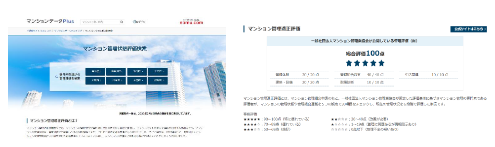不動産情報サイト「ノムコム」マンションデータPlusにマンション管理適正評価制度の管理評価を掲載