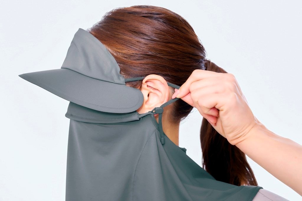 耳にかけるゴムひもはサイズ調節可能。耳の後ろは面ファスナー仕様で、着脱も簡単。空気口付きでムレにくく、暑い日でも快適な着用感。ウォーキングや自転車、ガーデニングなど、「顔だけしっかり守りたい」シーンにオススメです。