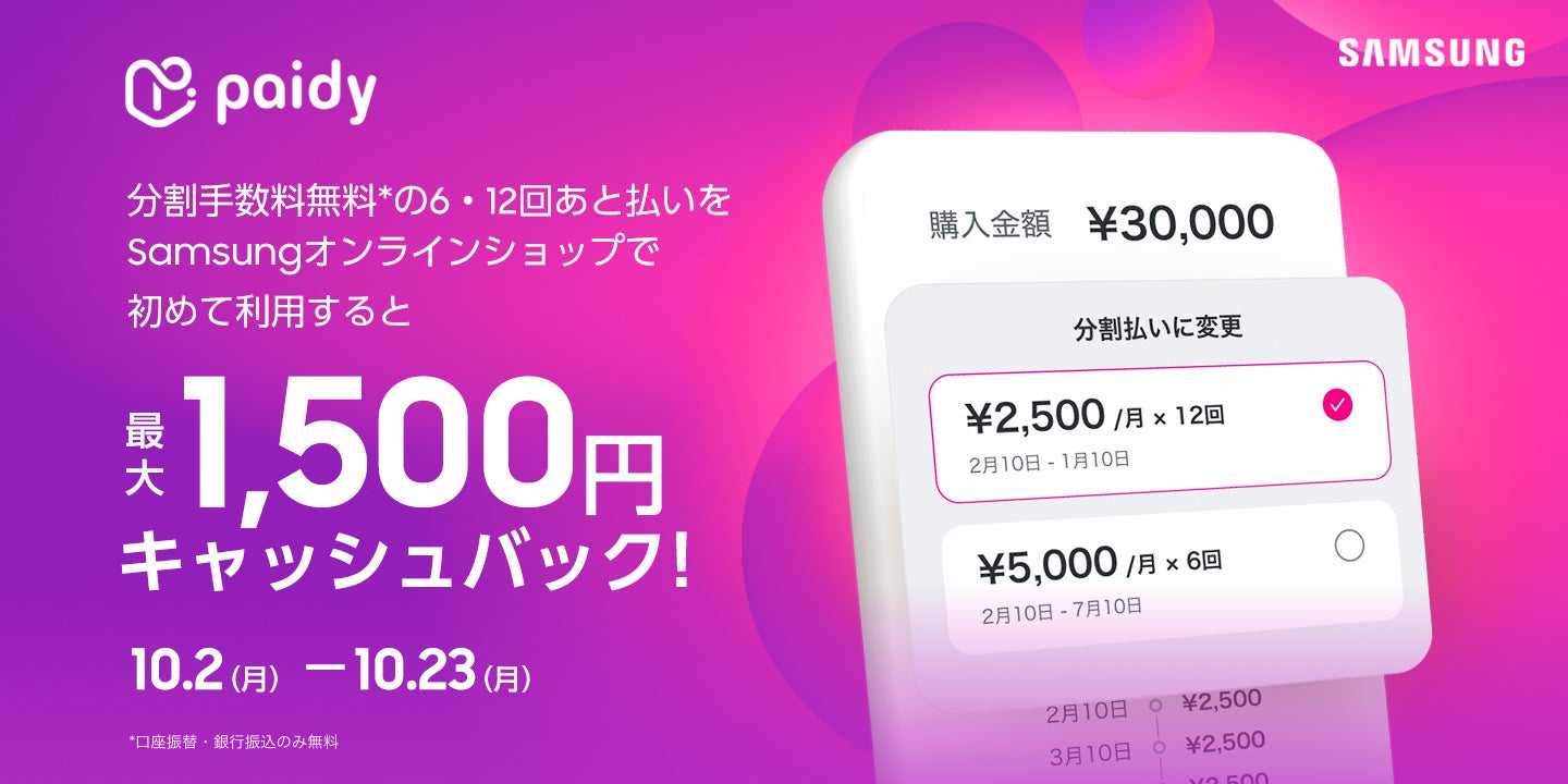 「ペイディ」分割手数料無料の6・12回あと払いを初めて利用するとSamsungオンラインショップで最大1,500円キャッシュバック!~本日2023年10月2日(月)からキャンペーン開始~