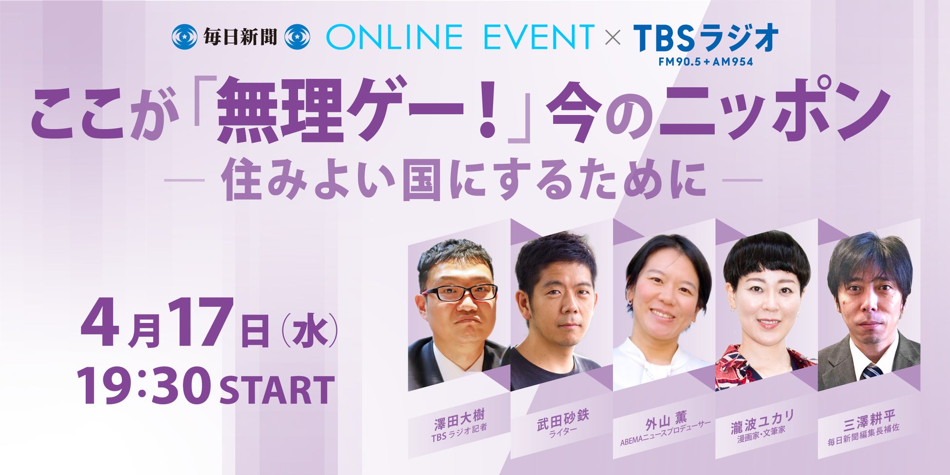 毎日新聞×TBSラジオ「武田砂鉄のプレ金ナイト」で4月17日(水)開催! ここが「無理ゲー!」今のニッポンー住みよい国にするためにー