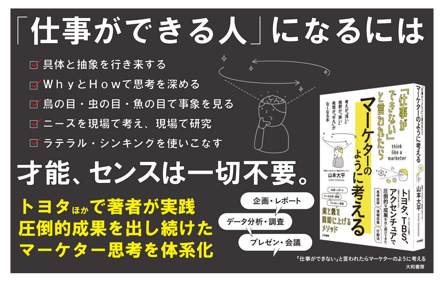 この本は、トヨタ自動車、TBS、アクセンチュアで著者の山本氏が「圧倒的な成果」を出し続けてきた「マーケターように考える」方法を惜しみなく凝縮。