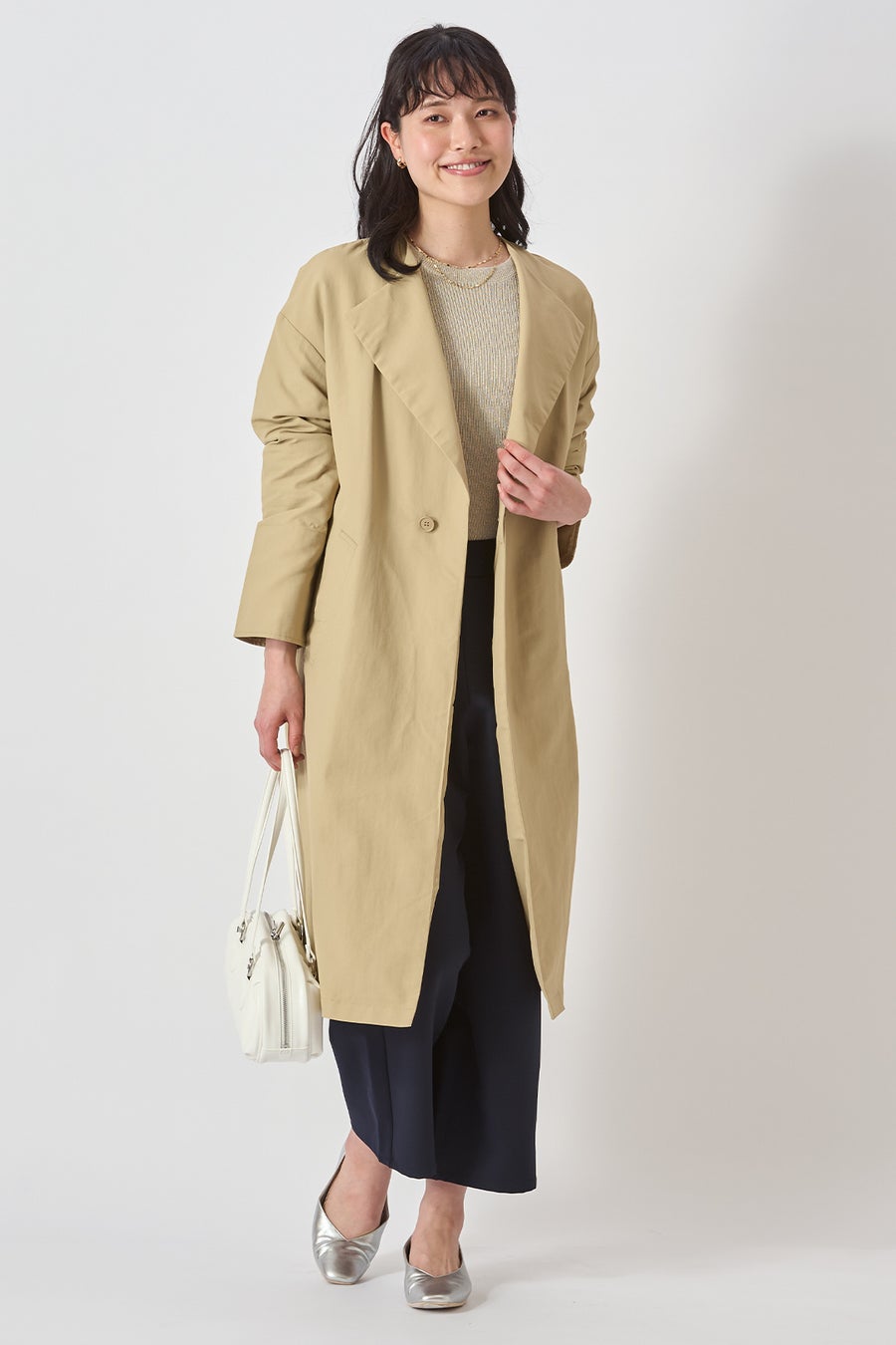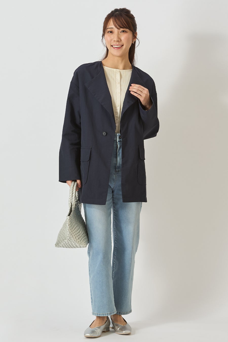 すっきりシンプルなノーカラーのデザインは、どんなコーデにも合わせやすくライトに羽織れます。ON/OFF兼用でシーズンレスに使えるのもうれしいポイントです。