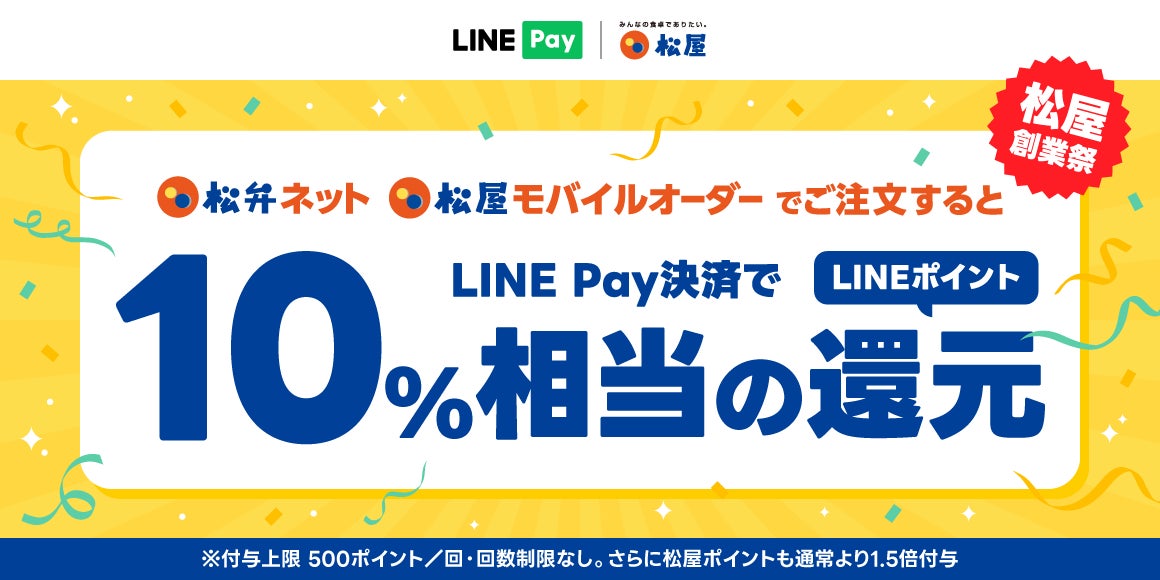 決済金額の10%のLINEポイントを還元(最大付与500ポイント/回・期間内回数無制限)