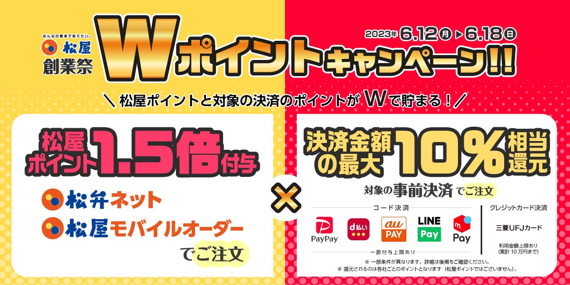 「創業祭Wポイントキャンペーン」は、6月16日の松屋創業日を記念し、1週間の期間中に「松弁ネット」「松屋モバイルオーダー」「松弁デリバリー」でご注文いただいたお客様に、松屋ポイントを通常の1.5倍付与、かつ対象の事前決済でご注文のお客様には各コード決済・クレジットカード決済から決済金額の最大10%相当(※)のポイントが各社から還元されるキャンペーンです。「松弁ネット」は松屋の公式お弁当WEB予約サイト。「松屋モバイルオーダー」は、松屋フーズ公式アプリの機能で、券売機を使わずに、スマホで簡単に、キャッシュレス決済にてご注文いただけるサービスです。券売機に並ぶ必要がないため、混雑時の待ち時間を短縮&じっくり余裕をもって商品をお選びいただけます。この機会にぜひ、ご利用ください。