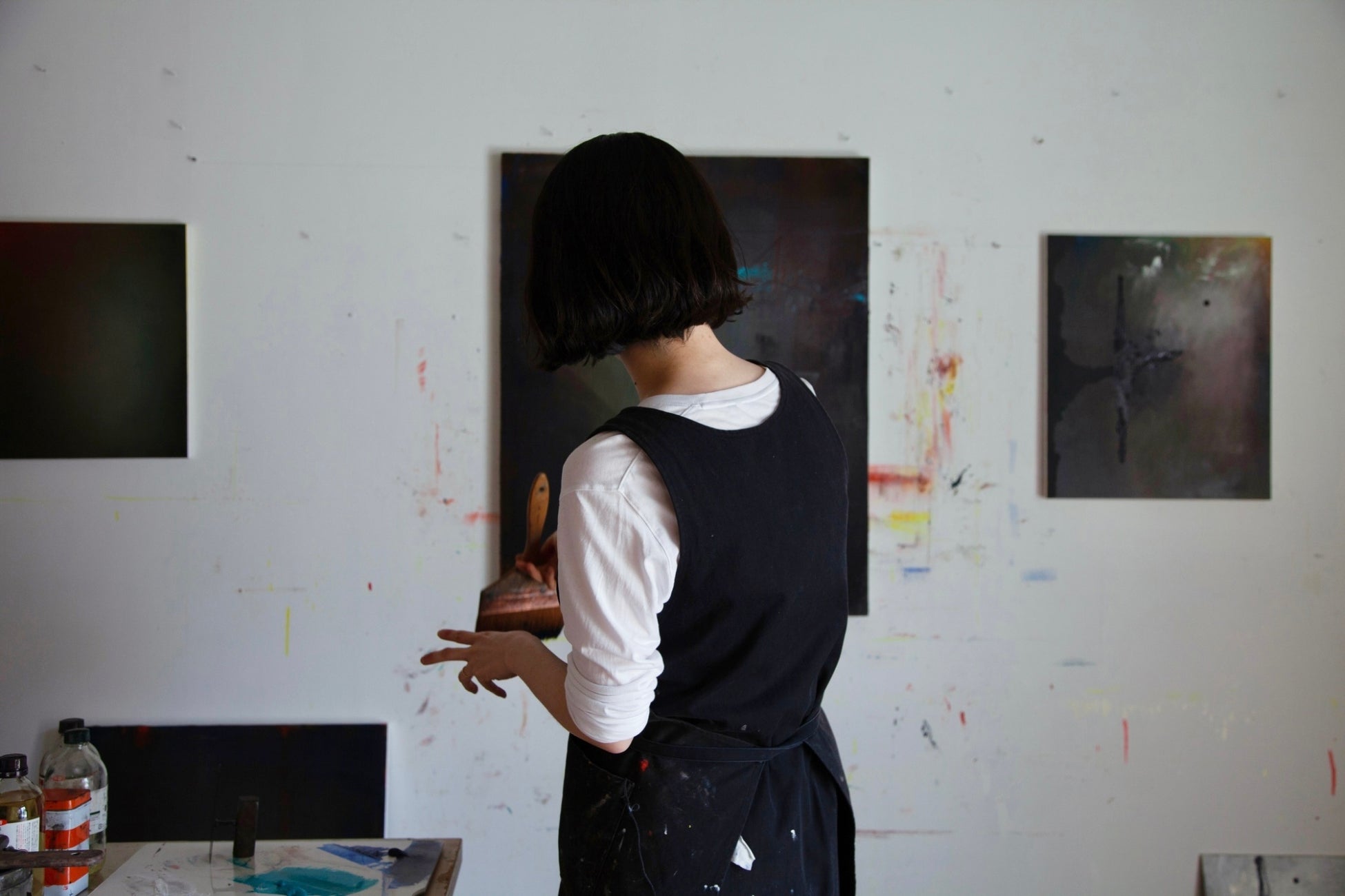平野は、日が暮れた森や何気なくふと見上げた空、山並みの風景などをスケッチしていた経験から、「形を捉えることではなく、自身の置かれた位置と風景の配列から誘発されるような感覚を元に筆を走らせた」と語ります。
