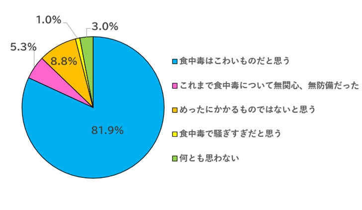 「食中毒はこわいものだと思う」と回答した方が81.9%で、回答した方のほとんどの方がこわいと感じているようです。その反面、「これまで食中毒に無関心、無防備だった」「めったにかかるものではないと思う」と回答している方も10%以上はいる結果となりました。