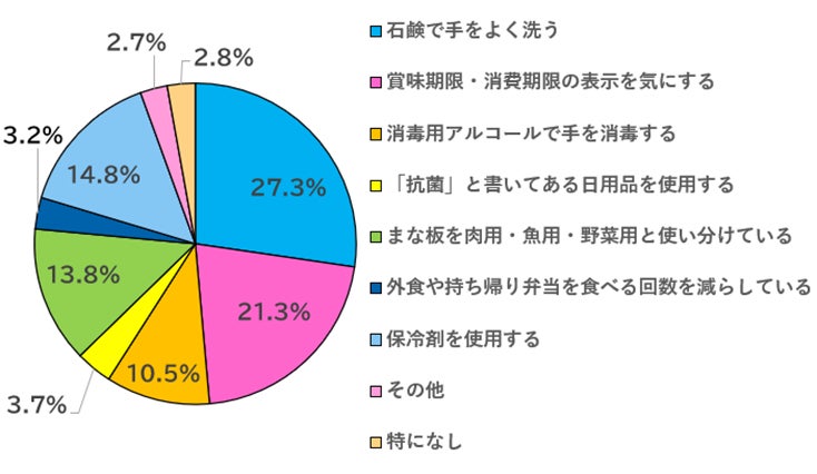 「石鹸で手を良く洗う」が一番多く、「賞味期限・消費期限の表示を気にする」「保冷剤を使用する」「まな板を肉用・魚用・野菜用を使い分けている」と回答した方が次いで多い結果となりました。