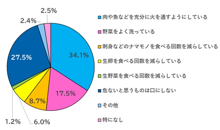 一番多かったのが「肉や魚などを充分に火を通すようにしている」と回答した方で34.1%。その次が「危ないと思うものは口にしない」と回答した方でした。やはり、よく見聞きする肉や魚の食中毒が一番気になり、気を付けている方が多いようですね。