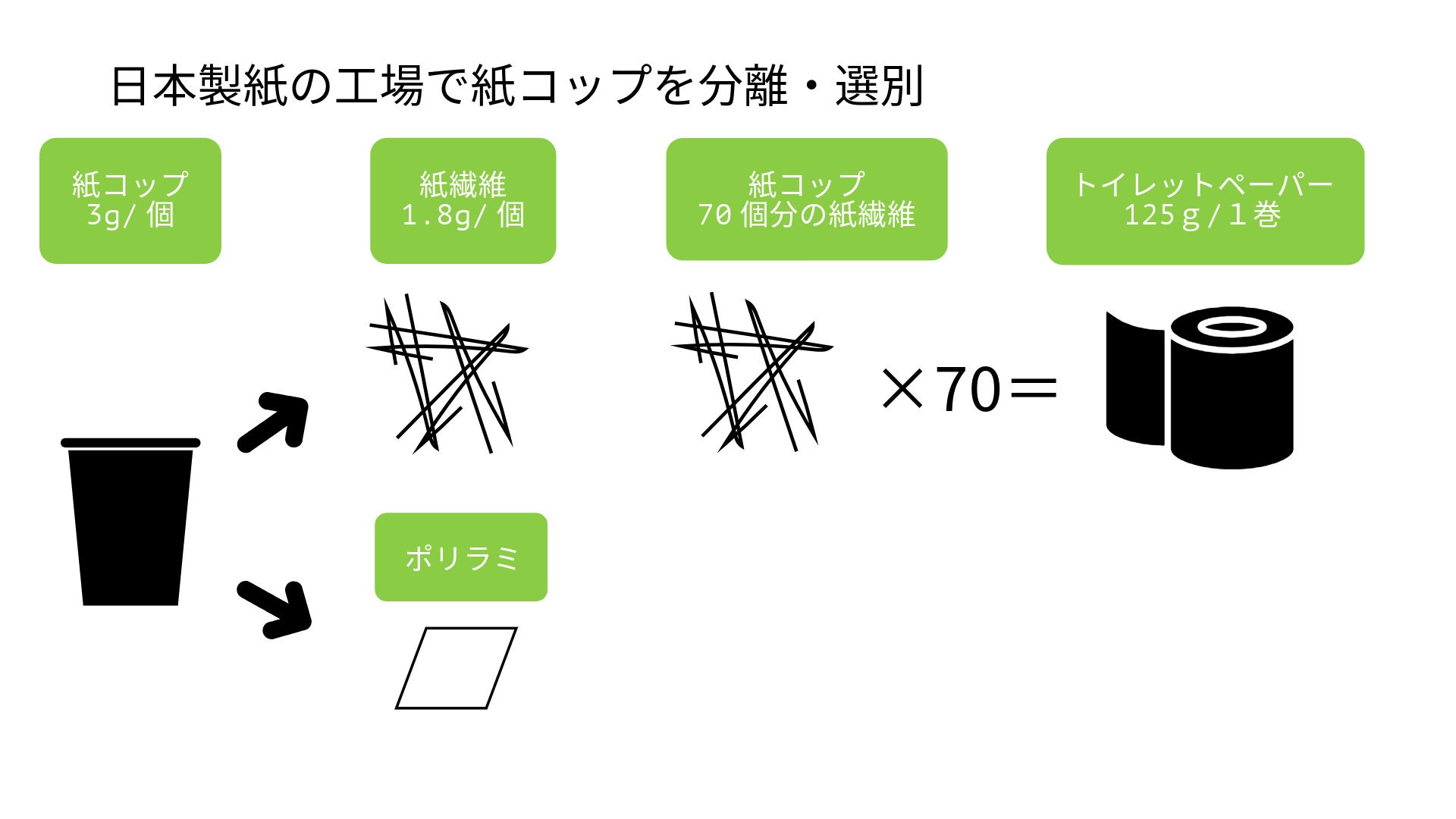 日本製紙はこの課題を解決するために、長年培ってきたリサイクル技術で、紙コップの表面に貼り合わされているプラスチックと紙をそれぞれの素材に分離し、再生紙繊維を取り出す技術に磨きをかけ、再資源化を実現しました。