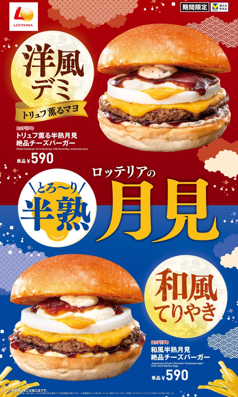 ロッテリアでは、1年で最も美しい月を愛でることができる月見の季節に合わせ、「ロッテリアのとろ~り半熟月見フェア」を開催中です。第1弾として、ロッテリアの人気商品に、月をイメージしたとろ~り半熟風たまごと、和風てりやきソースを合わせた「和風半熟月見 絶品チーズバーガー」など4品を販売し、大変ご好評をいただいています。