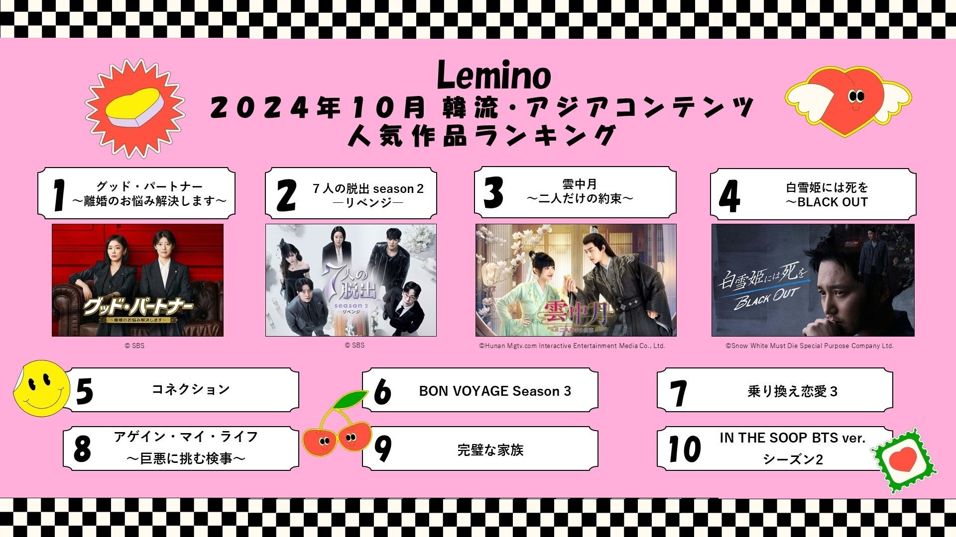 NTTドコモの映像配信サービス「Lemino®」は、2024年10月の韓流・アジアコンテンツの月間視聴数を集計し、「Lemino人気作品月間ランキング」を発表いたします。今月は、離婚弁護士が手掛けた法廷ドラマで、韓国で高い評価を得た『グッド・パートナー~離婚のお悩み解決します~』が第1位に輝きました。新着コンテンツでは、『FACE ME』『本物(チンチャ)が現れた!~まさか結婚するなんて~』が配信開始となります。