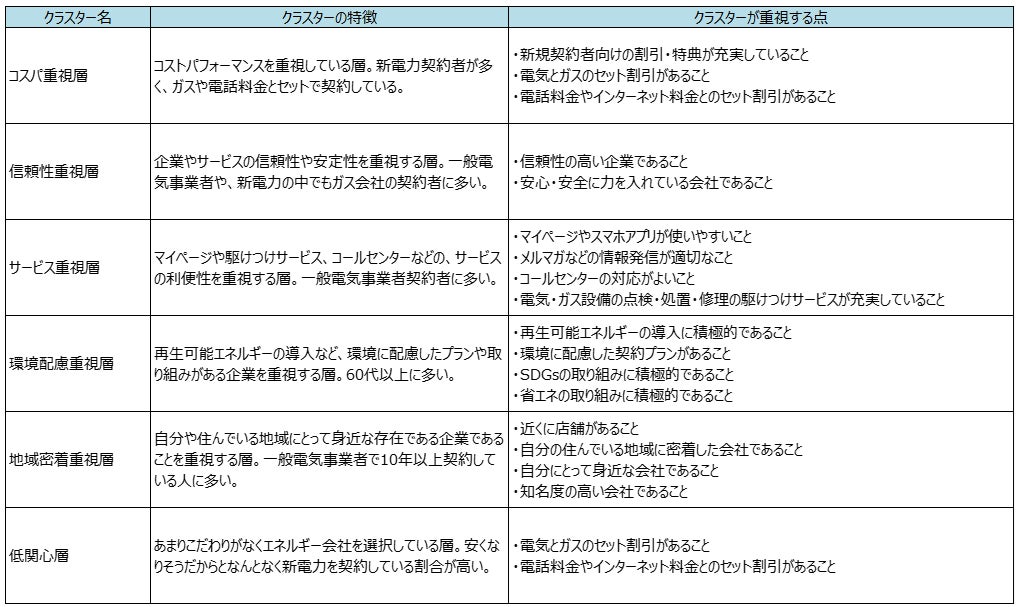 電力会社の選択する際における重視点の特徴をもとに消費者を分類するために、クラスター分析*を行ったところ、6つの選択重視点別クラスターに分類されました。各クラスターの特徴は以下の通りとなります。