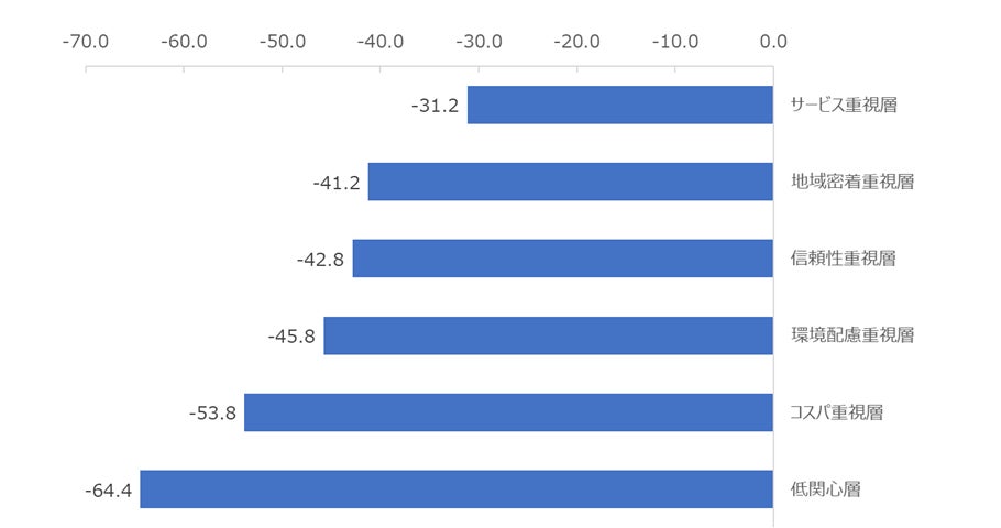 選択重視点別クラスター別にロイヤルティを測る指標であるNPS(Net Promoter Score)を分析したところ、最もNPSが高いのはサービス重視層(-31.2)となりました。次いで「地域密着層」(-41.2)、信頼性重視層(-42.8)が続きました。自社の顧客が重視する層の特徴やボリュームを把握し、クラスターごとのニーズに合わせたサービスを提供することがロイヤルティの観点からも重要であることが示唆される結果となりました。