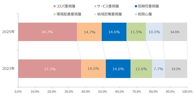 6つの選択重視点別クラスターのうち、最も割合が高いのはコスパ重視層(34.7%)であり、次いでサービス重視層(14.7%)、信頼性重視層(14.6%)となりました。また、2023年と比較すると、「コスパ重視層」がやや減少し、「地域密着重視層」が増加しました。