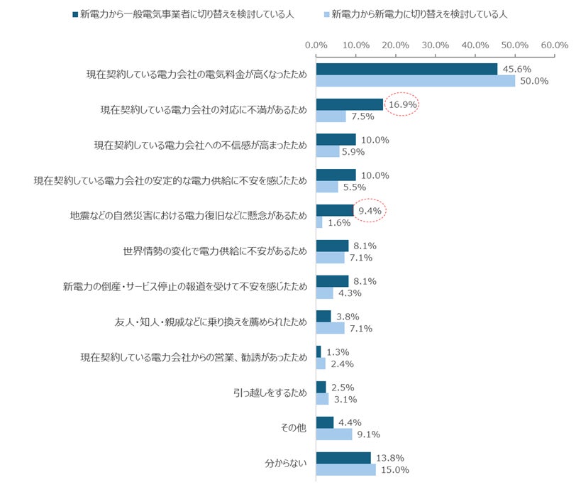 また、現在新電力を契約しており、契約変更の意向がある人に対しその理由を調査したところ、「現在契約している電力会社の電気料金が高くなったため」が他の理由と比較しても突出して高くなりました。また、「新電力から一般電気事業者に変更を検討している」人は「新電力から一般電気事業者に変更を検討している」人と比較して、「現在契約している電力会社の対応に不満があるため」(16.9%)や「地震などの自然災害における電力復旧などに懸念があるため」(9.4%)といった理由も高くなりました。