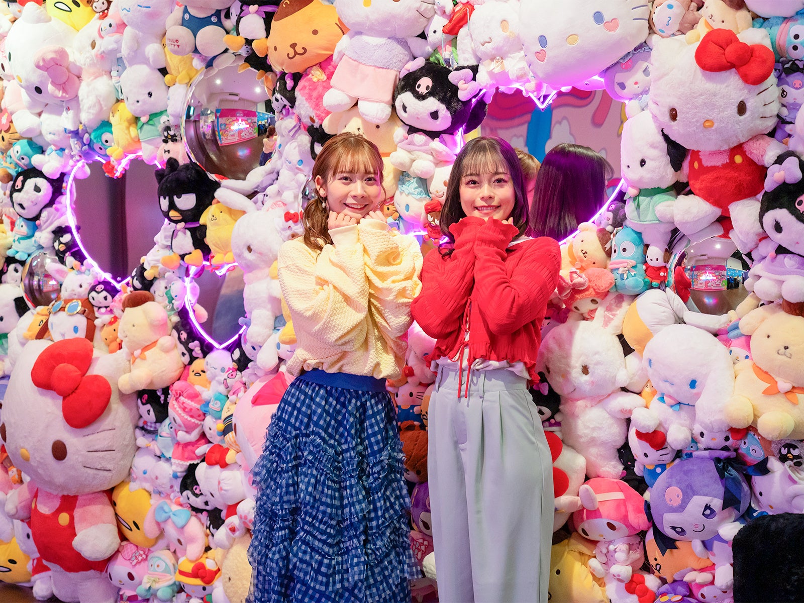 エンターテイメントホールでは、期間限定のスペシャルフォトスポット「カラフルピューロランドハウス」が登場します。 「カラフルピューロランドハウス」には、キャラクターたちのカラフルで没入感たっぷりのお部屋「推し色キャラルーム」やキラキラなクロミのスペシャルルーム「キラキラ★クロミルーム」、歌い手Adoとのコラボレーションによって生まれたアドローザトルマリィのスペシャルルーム「アドローザトルマリィルーム」も登場し、まるでキャラクターと一緒に過ごしているような、とびきり可愛い写真をたくさん撮影できます。初日を訪れたゲストの中には「このキャラクターと写真が撮りたい!」と駆け寄るお子さまや、「かわいい写真が撮れて嬉しい」とお友達と自撮りをして楽しむ様子などが見られました。さらにメディアお披露目会では、 「カラフルピューロランドハウス」に赤が印象的なコスチュームのハローキティ、黒をまとったバッドばつ丸、白を基調にしたコスチュームのウィッシュミーメルが特別に登場しました。バッドばつ丸とウィッシュミーメルは、新しいコスチュームを初めてお披露目し、会場を華やかな雰囲気に包みました。そのほか、エンタ-テイメントホールに登場した「巨大広告風☆推し色ウォール」、「推し色のぼり旗」や大きなハート型のアーチ、ぬいぐるみとミラーを組み合わせたフォトスポットなど、たくさんのフォトスポットで写真撮影を楽しむゲストの様子が見られました。