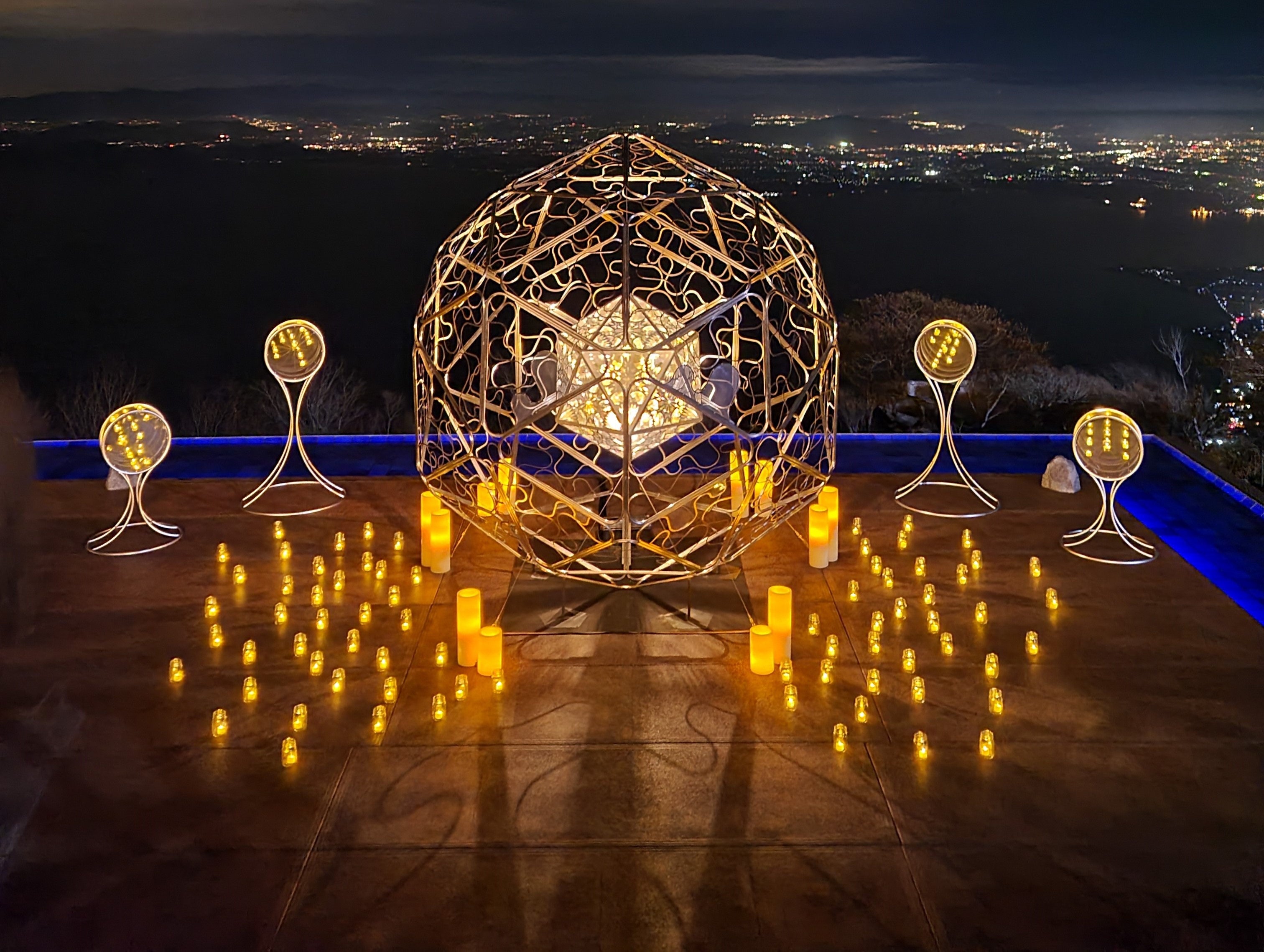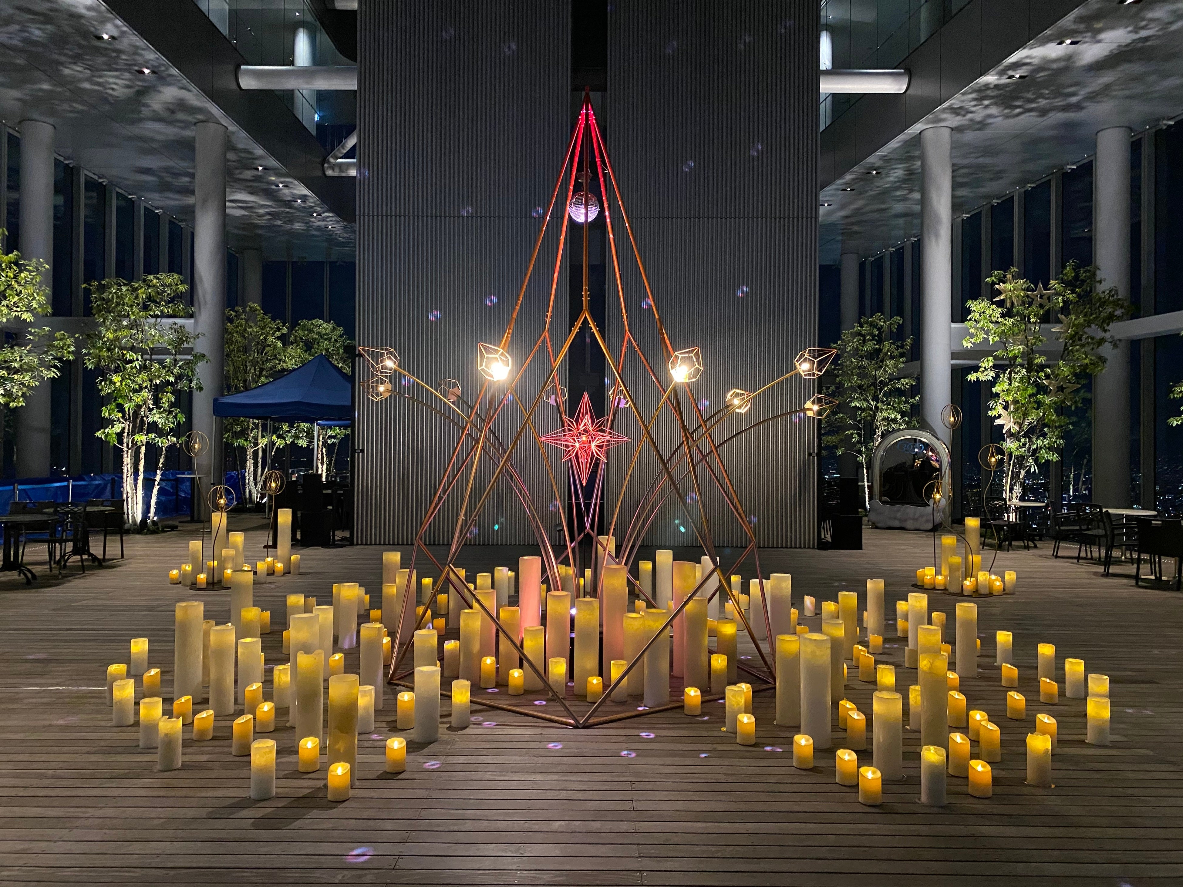 また、噴水の中には新進気鋭の金物造形アーティストユニット「sakishiraz(サキシラズ)」による、マジックミラーや偏光フィルムを組み合わせたアイアンオブジェを設置。LEDキャンドルの灯りや、噴水の水面に反射して光る灯りと共鳴して光り輝き、訪れる方をフォトジェニックで癒しの非日常空間へといざないます。