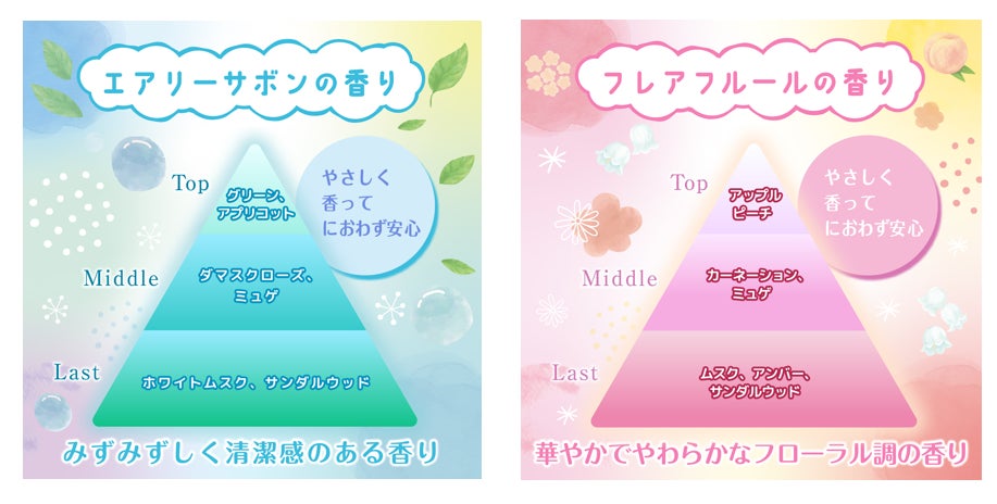 香りは〈エアリーサボンの香り〉と〈フレアフルールの香り〉の2種類で、日本かおり研究所が監修しています。