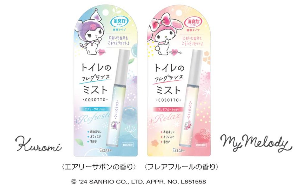 エステー株式会社は、外出先のトイレで気になるにおいをこそっと消臭できるミストタイプのスプレー「消臭力 トイレ用 携帯タイプ」を株式会社サンリオの人気キャラクター「クロミ」、「マイメロディ」を起用したデザインに一新してリニューアル、9月27日から全国のスーパー、ドラッグストア、ホームセンター、ネットショップなどで新発売します。