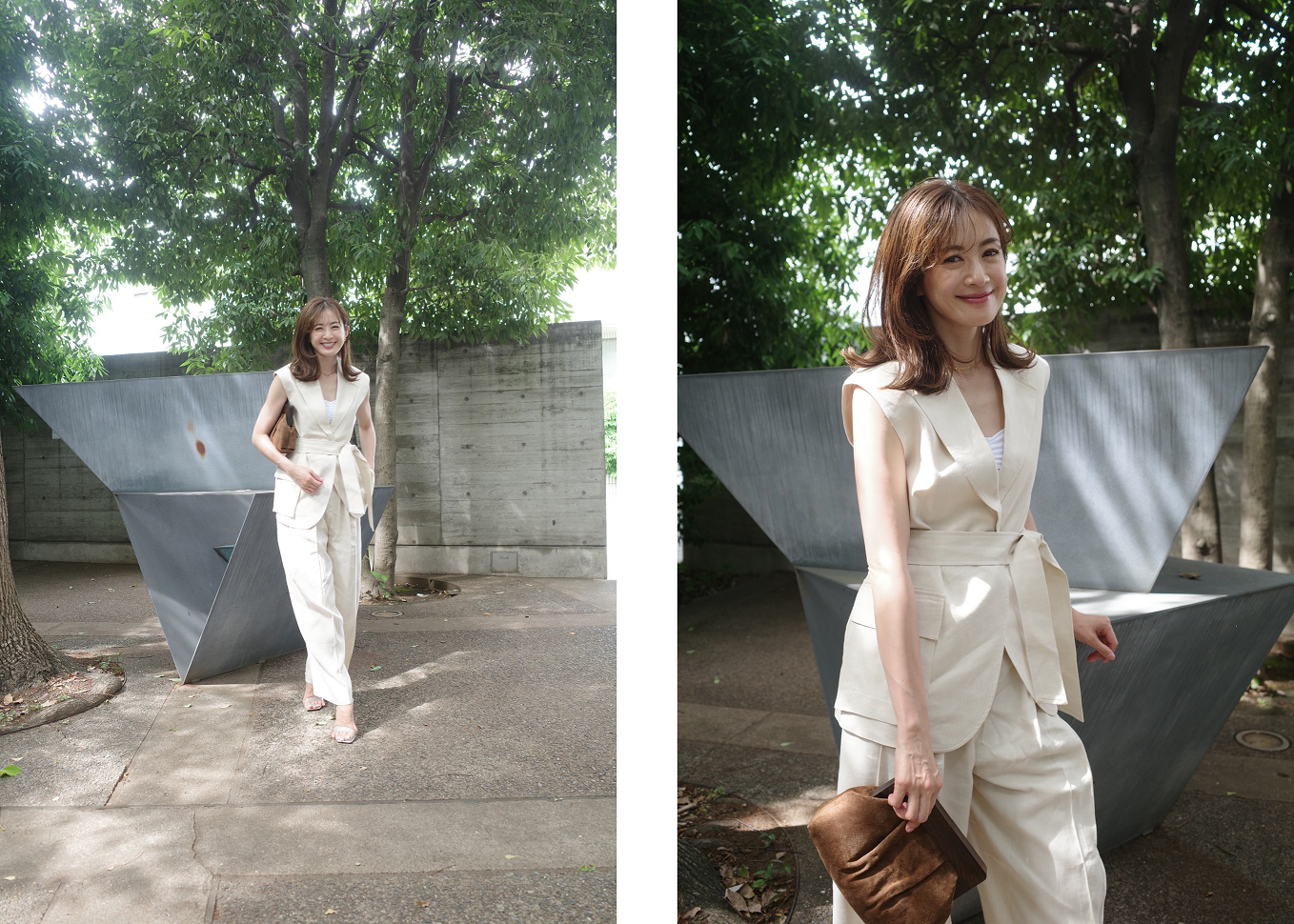 ビスコースのドレープ感とリネンの清涼感で、肌触り良く上品な印象のジレ×ワイドパンツのセットアップ。木製のハンドルとイタリア製の上質なスエードのコントラストが魅力の上品なクラッチバッグを合わせてより洗練された雰囲気に仕上げています。