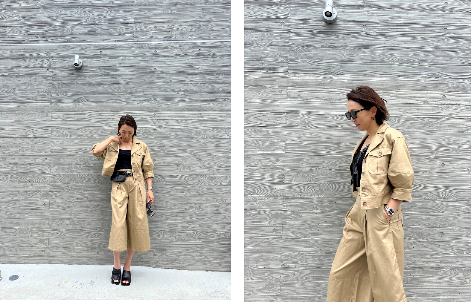バナリパらしさ溢れたオーセンティックなヘリテージデザインのディテールが特徴のクロップド丈ジャケットとキュロットのセットアップに上質なレザーベルトバッグを合わせたユーティリティスタイル。セットアップは暑い時期も快適に過ごせるリネン混素材で季節の変わり目に重宝するアイテムです。