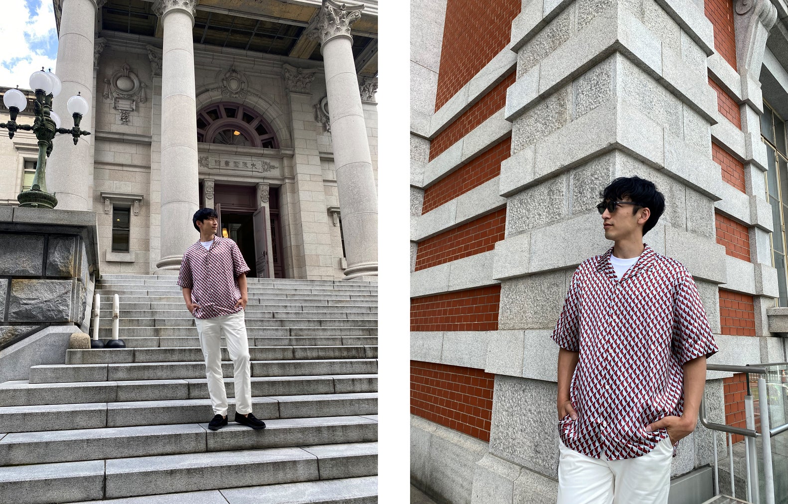 一枚で着映えする大胆な抽象柄が魅力のリゾートシャツにスリムパンツを合わせたリゾートルック。贅沢なシルクで仕立てられたシャツは、上品な光沢感と着心地の良い肌触りで品の良いカジュアルスタイルに仕上げます。