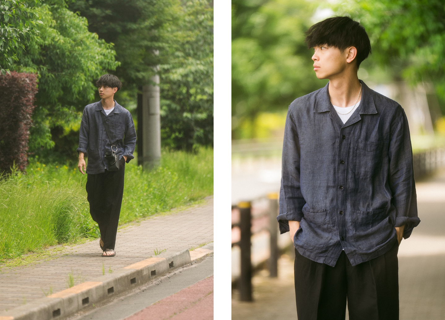 リネンのヘリンボーン素材を使用し、リゾートシャツとシャツジャケットを融合させたスタイリッシュなシャツにワイドパンツを合わせたリラックススタイル。夏のレイヤリングや羽織としても活躍する汎用性の高いユーティリティシャツに注目です。